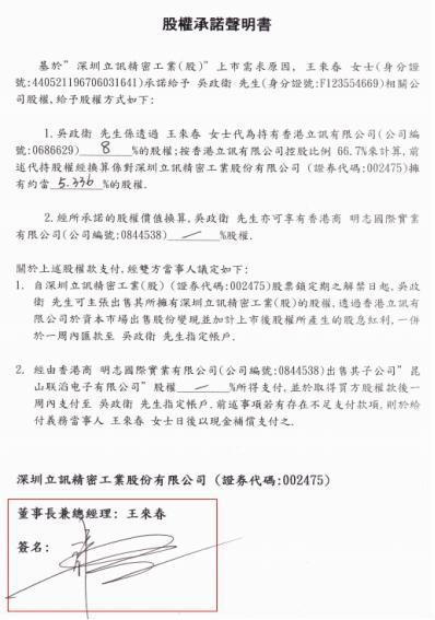 2020年8月,中国经济网报道称,中岳联拓总经理、原立讯精密集团管理中心高管吴政卫出示了一份由立讯精密实控人、董事长王来春签署的《股权承诺声明书》,指控王来春曾代持其拥有的立讯精密股份。代持股份约占股份总额的5.336%,市值达199.93亿元。