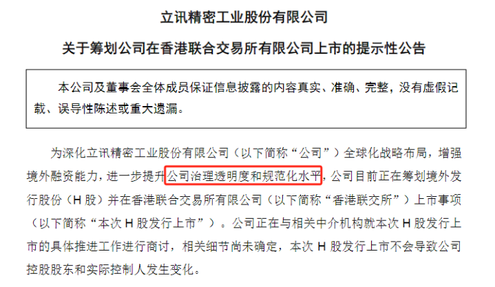 公告显示,立讯精密筹划H股发行旨在深化全球化战略布局、增强境外融资能力,并进一步提升公司治理的透明度和规范化水平。公司正在与相关中介机构就H股发行上市的具体工作推进磋商,相关细节尚未确定,本次发行不会导致控股股东和实际控制人变更。